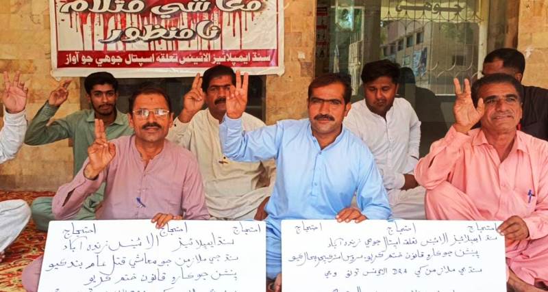 Johi (Report by Mansoor Gadehi) On the call of the Sindh Employees, government workers continued their protest for the acceptance of their demands. The staff of Taluka Hospital Johi observed the fifth consecutive day of protest by boycott the OPD service.