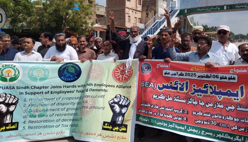Tando Jam (Report by Munsif Ahmed Talpur) Like across Sindh, government employees in Tando Jam also staged a strong protest against the proposed changes in pension rules. A large number of employees from the Agricultural Research Center, Sindh Agriculture University Tando Jam, Rural Health Center, Pakistan Medical Alliance, and Livestock Department participated in the protest. The participants held rallies and gathered at Workshop Stop before marching towards the Tando Jam Press Club. During the protest, employees raised slogans and strongly criticized the government’s attitude. Addressing the rally, leaders including Dr. Fahad Nazir Khuhso, Malook Ojun, Sharif Kathio, Mumtaz Baloch, Ali Roshan Channo, Abdul Haye Bhutto, Khawar Memon, and Dr. Naveed Memon said that government employees had been protesting for weeks but the government had yet to pay any attention to their demands. They warned that if this behavior continued, government offices would remain shut as employees were being subjected to “economic murder.” The leaders pointed out that while the government had increased the salaries of a certain class by up to 300 percent, it was terming ordinary government employees as a burden on the economy and conspiring to snatch away their only support in old age—the pension—something they would never accept. According to the speakers, as the announced sit-in date approaches, the protest movement is gaining momentum and government employees are fighting for their survival. They made it clear that until the black law of pension cuts is withdrawn, there would be no negotiations with the government. The employee leaders announced that on October 6, government employees from across Sindh would gather in Karachi to besiege Bilawal House. They warned that if the government resorted to the use of force or adopted an aggressive stance, the entire responsibility would fall on the Chief Minister of Sindh.